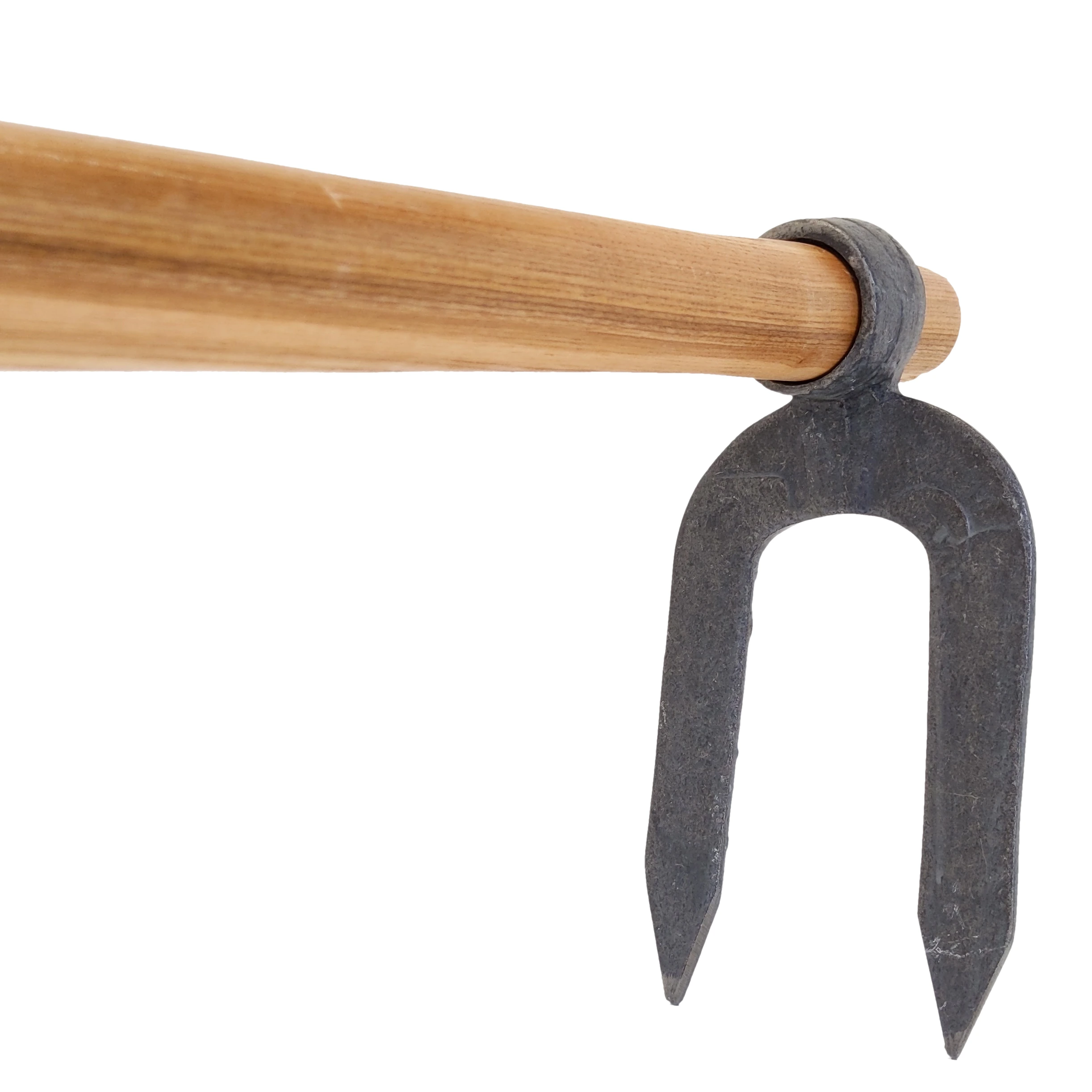 Handgeschmiedete Kartoffelhacke / Karsthacke von Krumpholz Nr. 1642 mit zwei spitzen Zinken (220 x 120mm ) und lackierten 130 cm Eschen-Stiel. Zur Bodenauflockerung und zur Ernte von Feldfrüchten. Gewicht von ca. 1,8 kg.