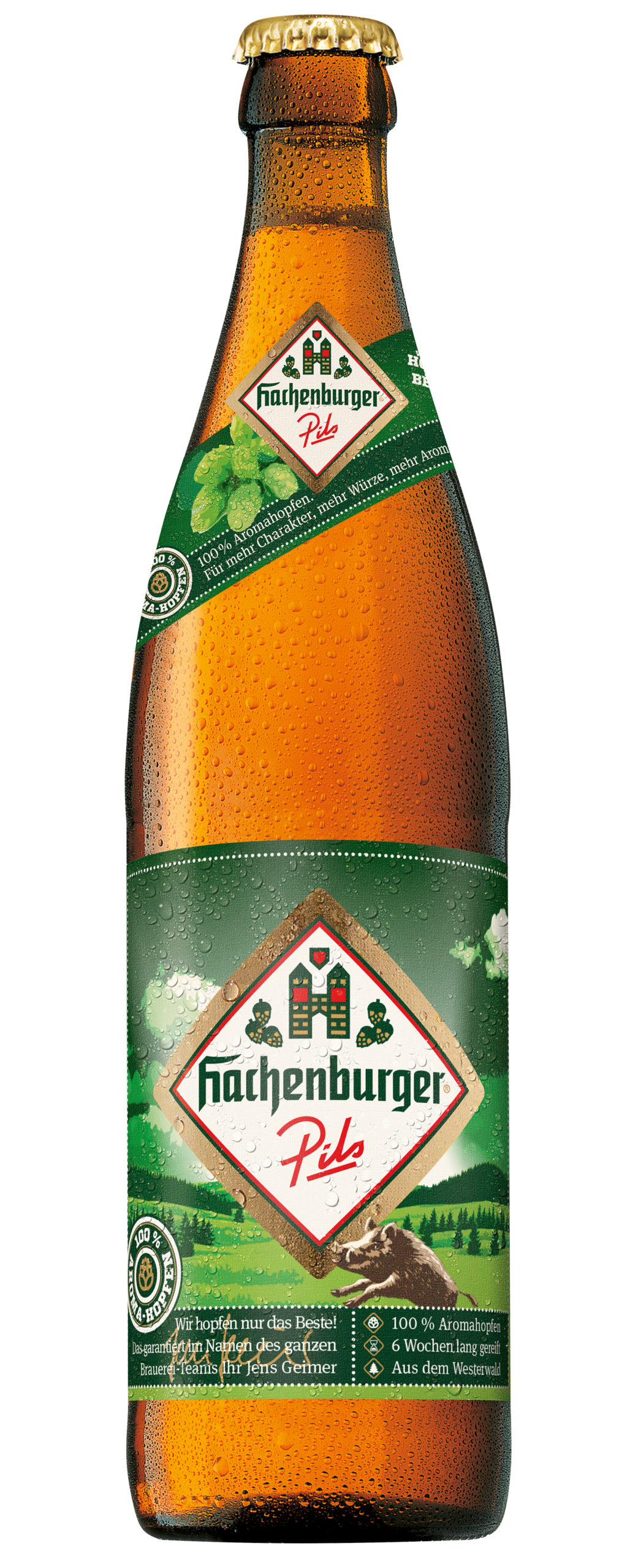 Wir brauen unser Hachenburger Pils zu 100 % mit Aromahopfen – wie übrigens all unsere Biere. Das ist völlig außergewöhnlich – das tut in Deutschland fast niemand. Aber genau das macht den besonderen Geschmack aus: Das macht es würziger, aromareicher und charaktervoller. Kein Massenbier – sondern unsere Hachenburger Pils-Spezialität.