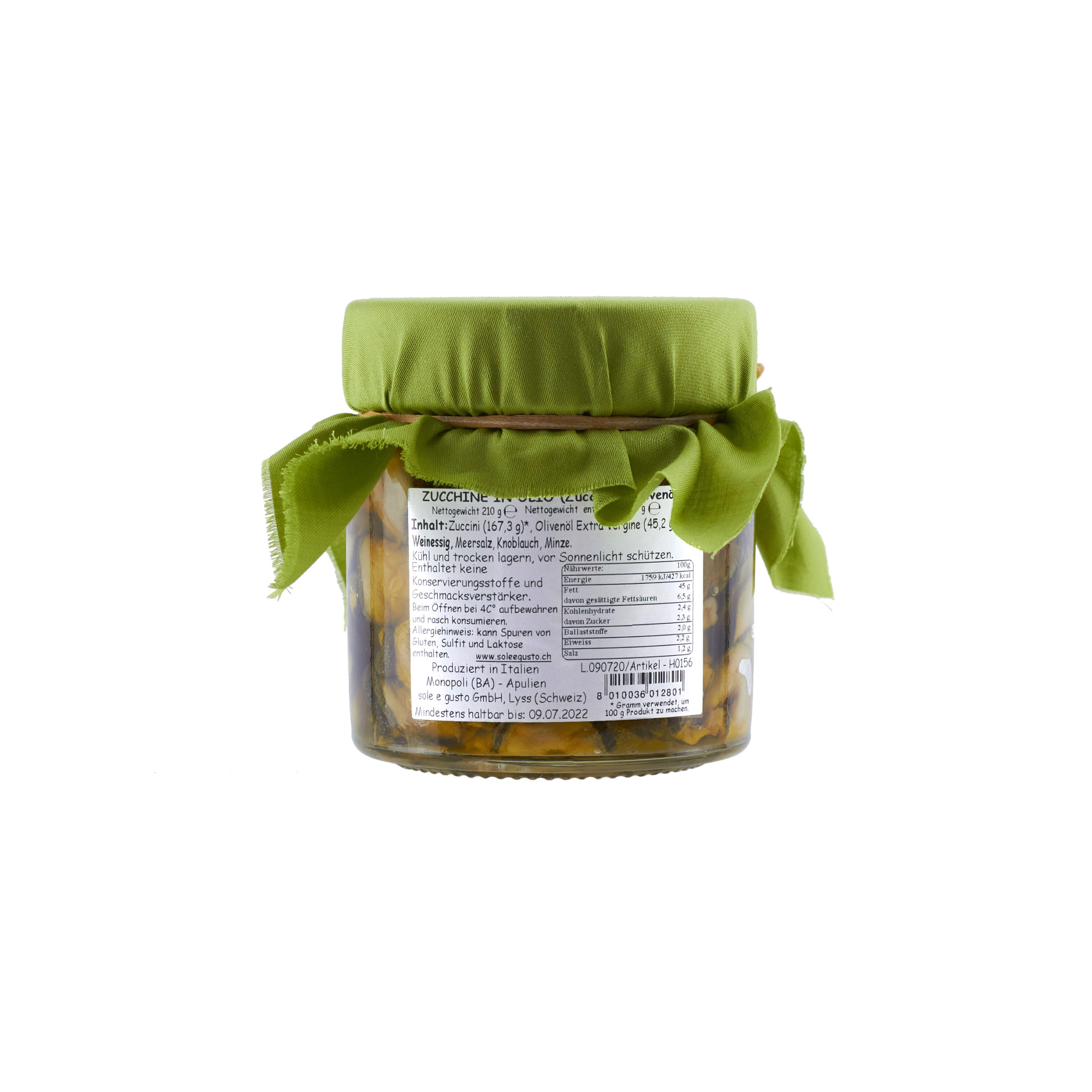Inhalt: Zucchetti, Olivenöl 25%, Meersalz, Peperoncino, wenig Knoblauch, Petersilie (keine Konservierungsstoffe enthalten)